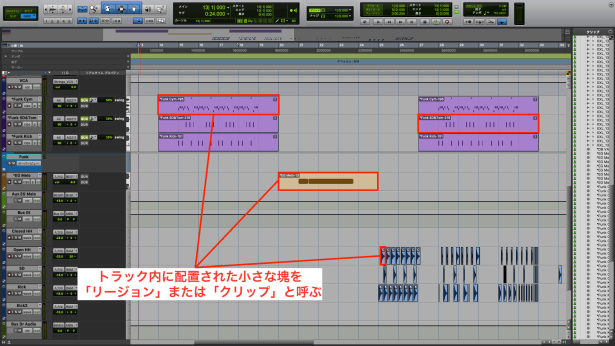 トラックの中には1〜複数個のリージョンが配置されており、リージョンごとにデータを移動させたり編集したりすることができます。