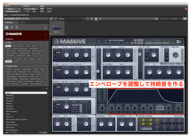 ※例によってここからはNative Instruments社のMASSIVEを使用して解説していきますが、他のシンセ音源でも同様の処理が可能です。お手持ちの音源に付属のマニュアルをご参照ください。