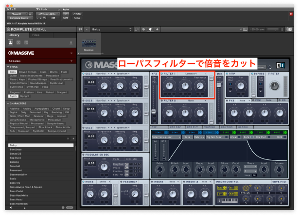 つぎに、フィルターで倍音成分をコントロールしていきましょう。