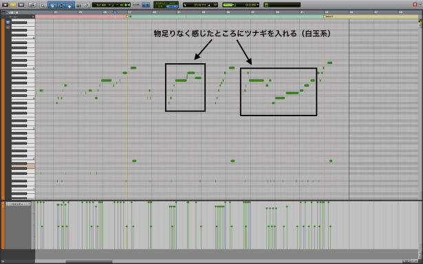 1で打ち込んだ間の手だけでは若干もの足りなく感じる場合は、その合間にツナギを入れていきましょう。