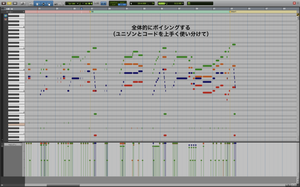 メインメロのフレーズの終わり(ブレスポイント)などを狙って、派手目のフレーズをちりばめていきます。