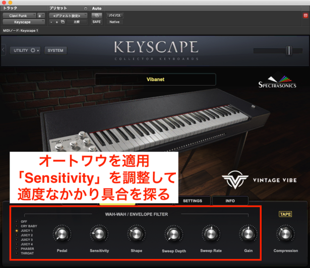 その上で、オートワウをかけてファンキーなクラビサウンドに仕上げています。