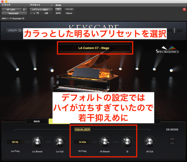 デフォルトのセッティングでは若干音が硬すぎたので、音源内部のEQを使って少しハイを抑えています。