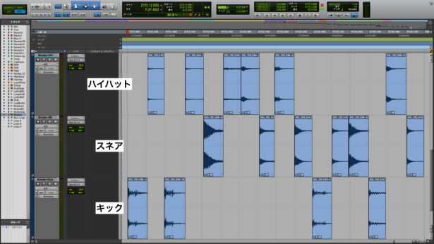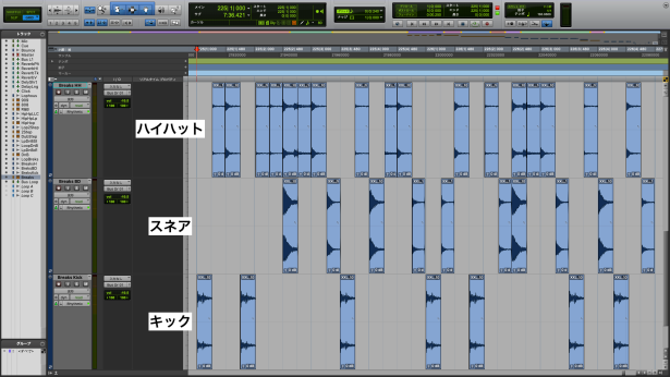元となる素材からキック、スネア、ハイハットの3点を切り出し、それらを並べ替えて新しいビートを作るというのも常套テクニックです。
