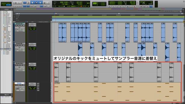 今回は、オリジナルのキックをミュートした上で、新たにキック、スネア、ハイハットの3点を加えてみました。