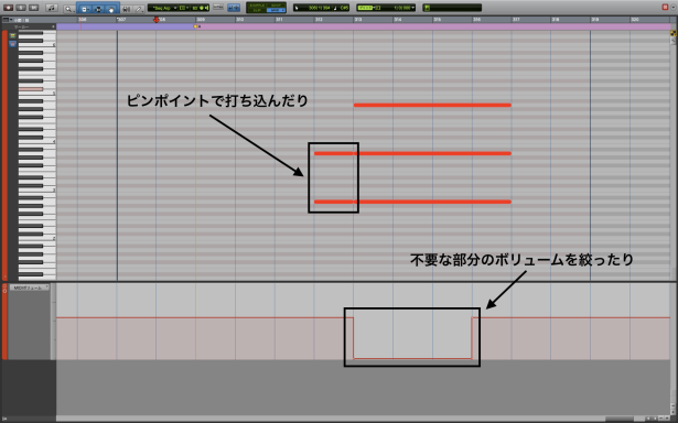 必要な部分にピンポイントで打ち込んだり、不要な部分のボリュームを絞って音を消したりして使いましょう。