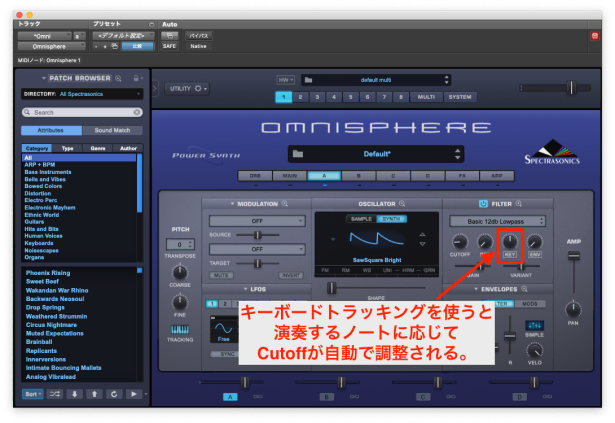 そんな時は、キーボードトラッキングをオンにすることで、実際に演奏しているノートに合わせた適切なカットオフ周波数を自動的に設定することができます。