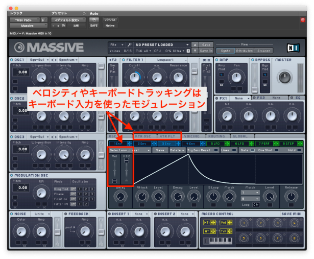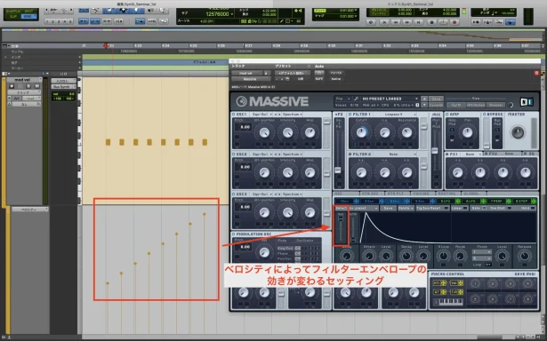 例えば、ベロシティが強い場合にフィルターが開き、ベロシティが弱い場合にフィルターが閉じるといった、ベロシティと連動したフィルターの制御などを行うことができます。