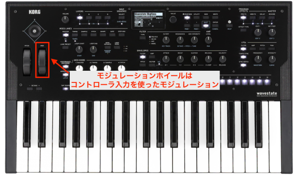 また、キーボード入力のノート高(ノートナンバー)によってフィルターのかかり具合を調整することができる「キーボードトラッキング」も、キーボード入力を利用したモジュレーションの一種と考えることができます。