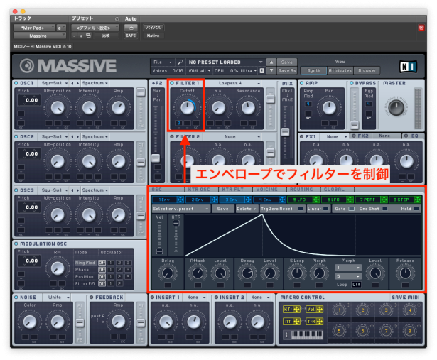 アンプリチュードエンベロープ同様、フィルターエンベロープも、エンベロープを使ってフィルターのカットオフを制御するモジュレーションとなります。