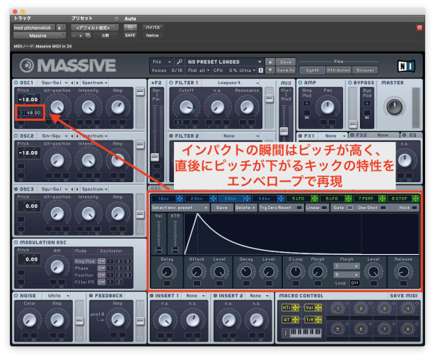 エンベロープを使ってオシレータのピッチ(周波数)をコントロールすることもできます。