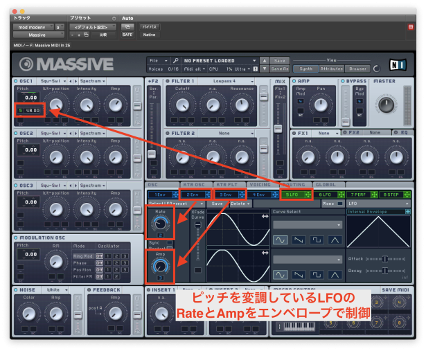 また、LFOのRateもエンベロープでコントロール可能。